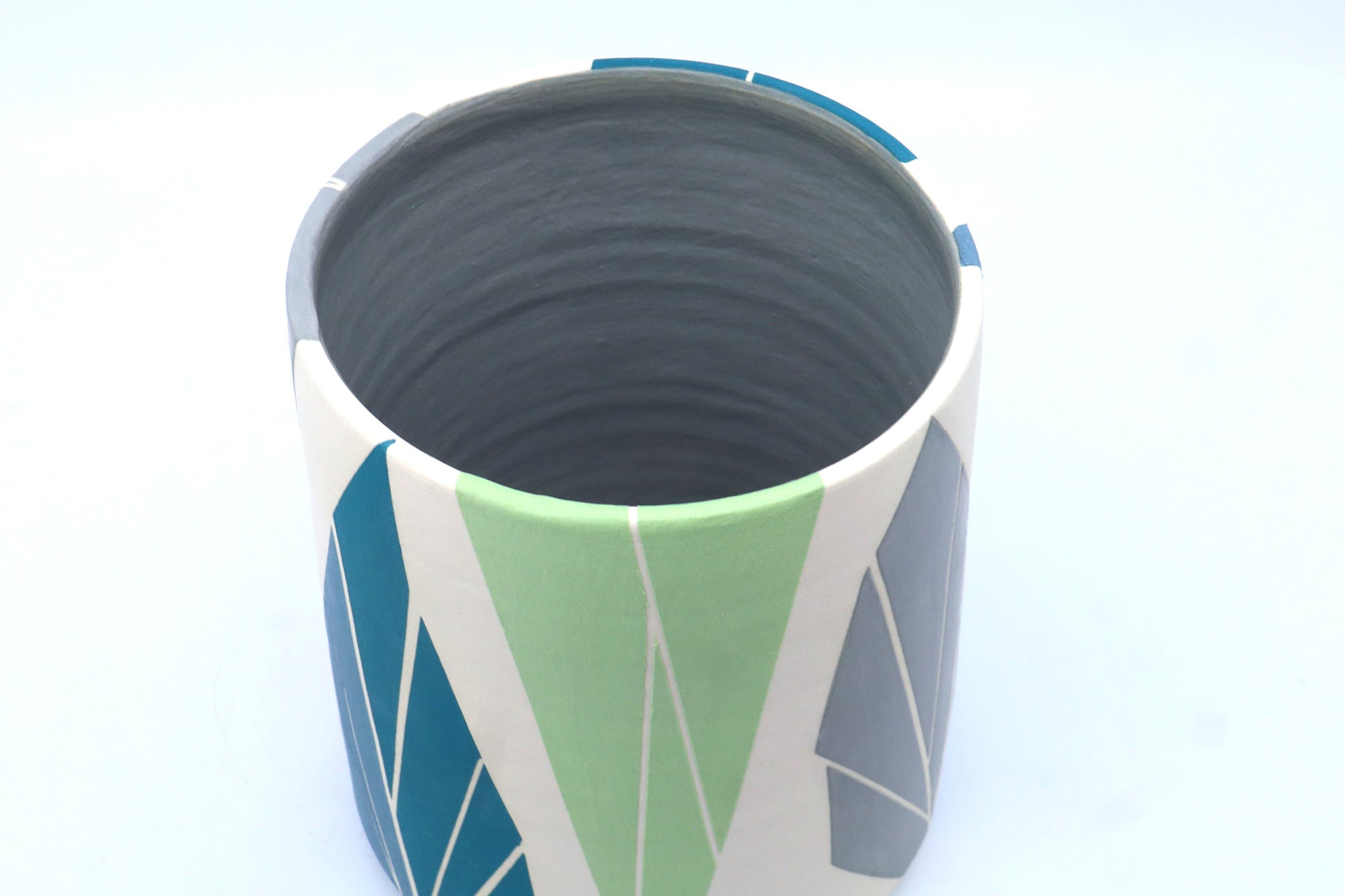 Each line has been carefully masked by hand and adorned with vibrant underglazes, finished with a matte interior glaze.