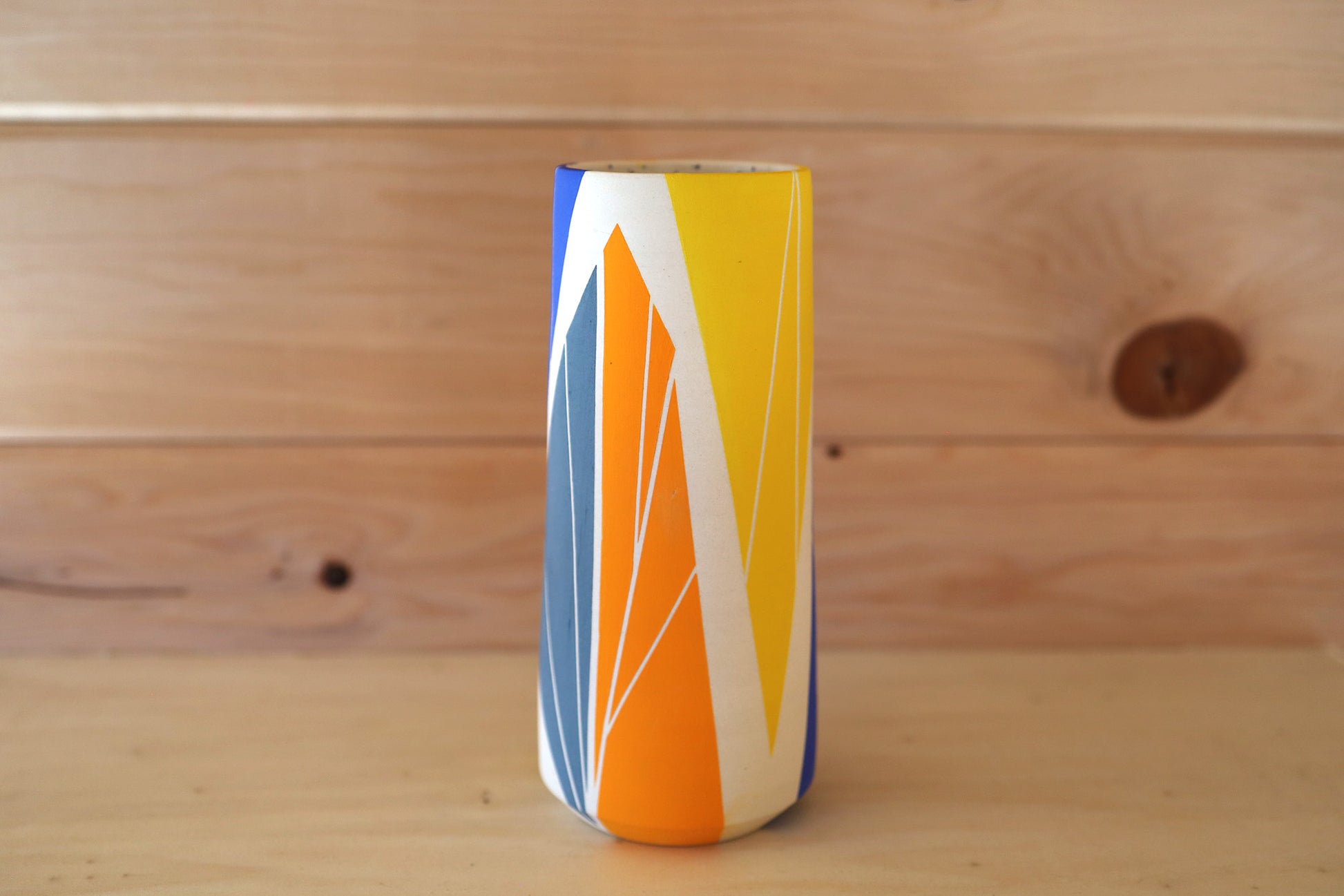 Features a glossy speckled white interior and matte and bright coloured underglazes that delicately wrap over the vase's lip.