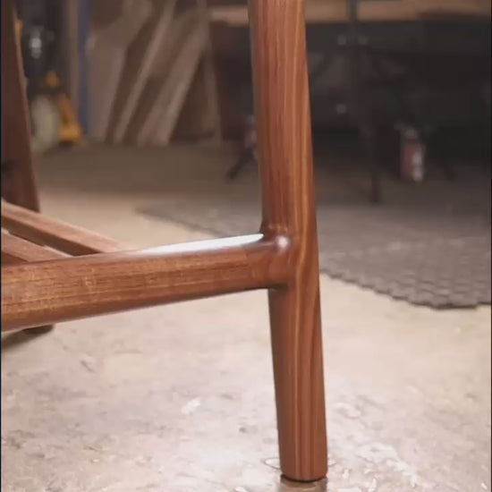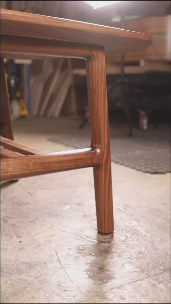 Crafted from beautiful dark walnut, this piece features a slatted shelf beneath the tabletop for discreet storage, with seamlessly joined slats and a wood grain that echoes the curved edges of the top. The uniform color and grain throughout, complemented by smooth and rounded edges as well as our signature bookmatched skateboard top, highlight our commitment to exceptional craftsmanship and personal style, while paying homage to the distinguished tradition of Danish furniture design.