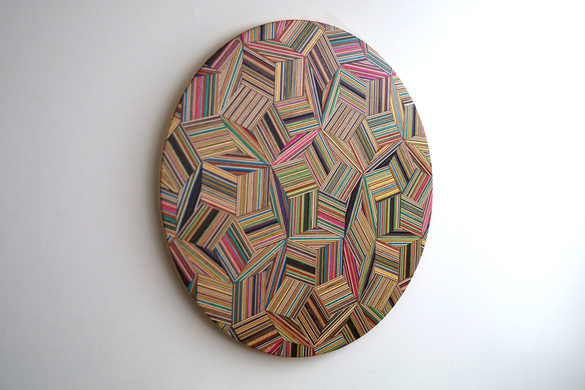 This unique circular art piece is crafted from recycled skateboards, carefully cut into Penrose rhombs—an intricate, non-repeating geometric shape known for its mesmerizing, aperiodic pattern—creating a captivating visual effect.