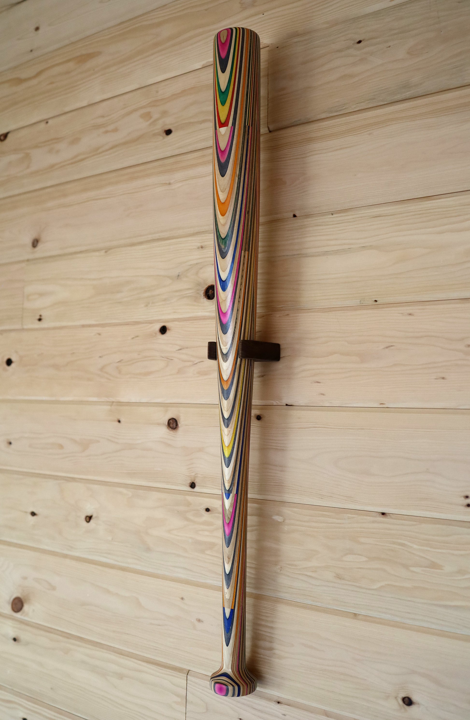 This unique bat has been skillfully crafted by laminating together several recycled skateboards and shaping it on a lathe. It can be oriented in various ways to achieve either a more linear or concentric appearance and to switch up the colour palette!
