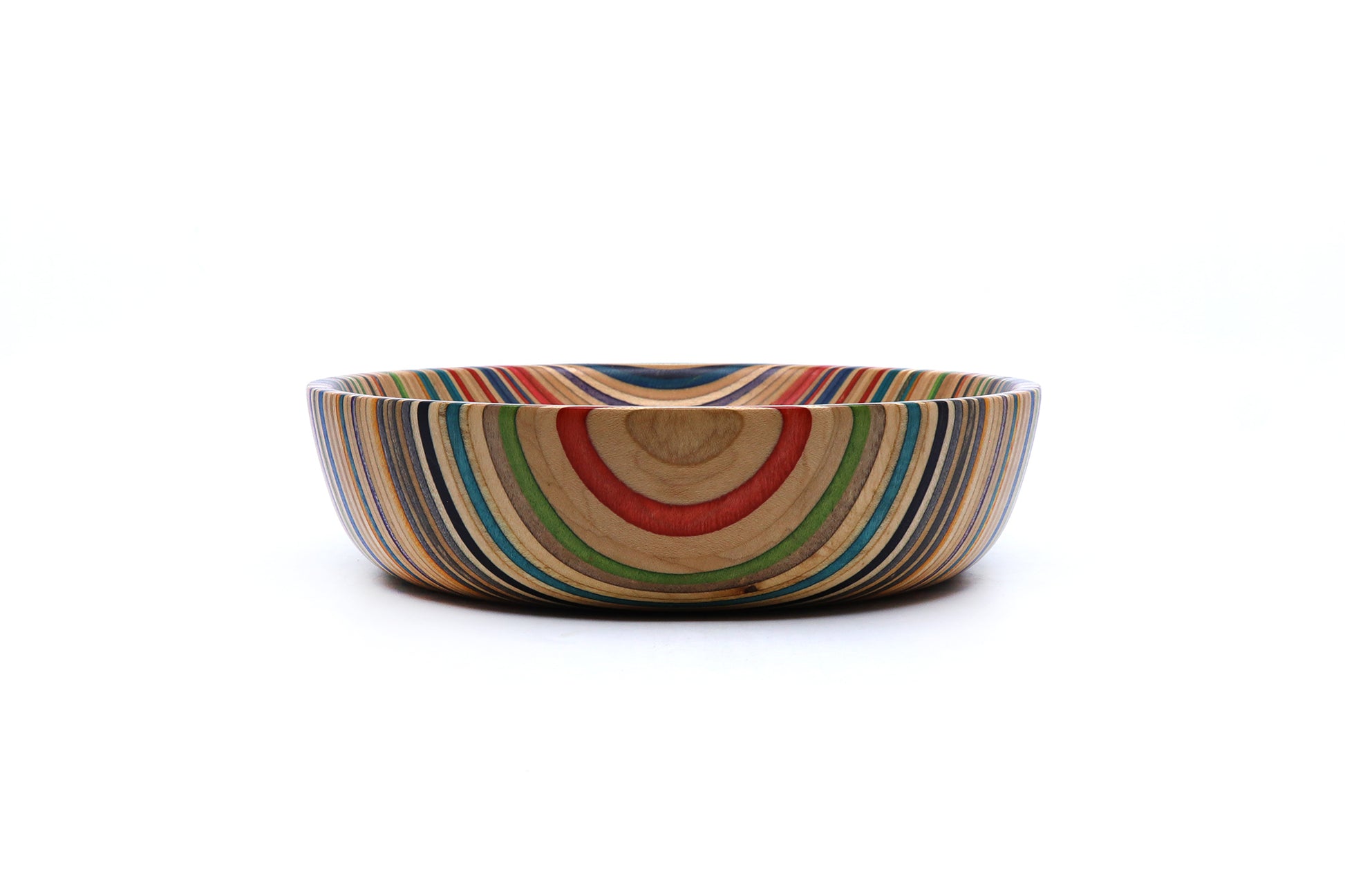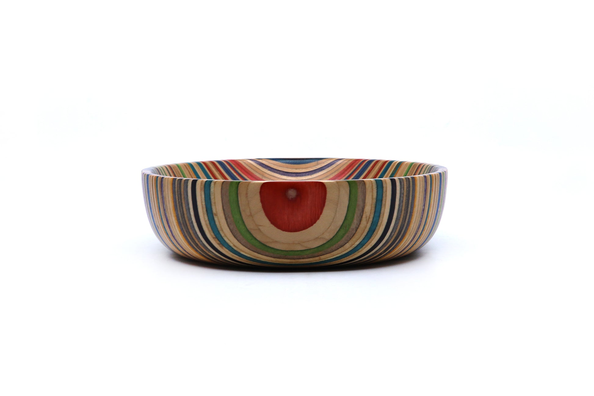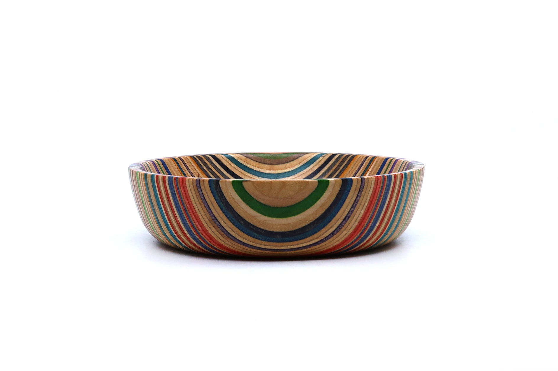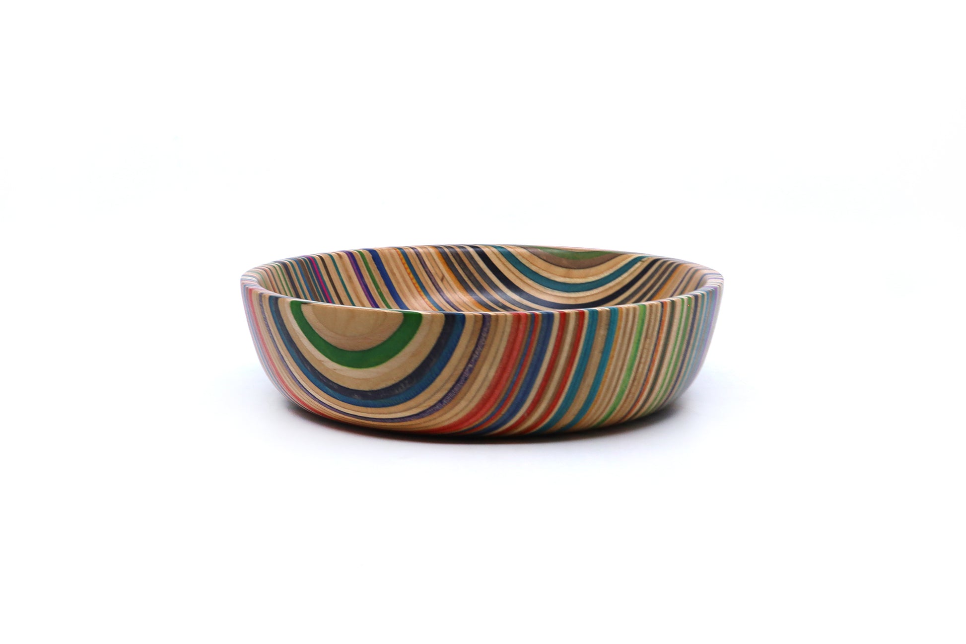 Our unique valet dishes are created from recycled skateboard noses and tails, laminated and expertly shaped on a lathe. These colorful, striking pieces can serve as decorative art or practical entryway bowls for keys and small items.