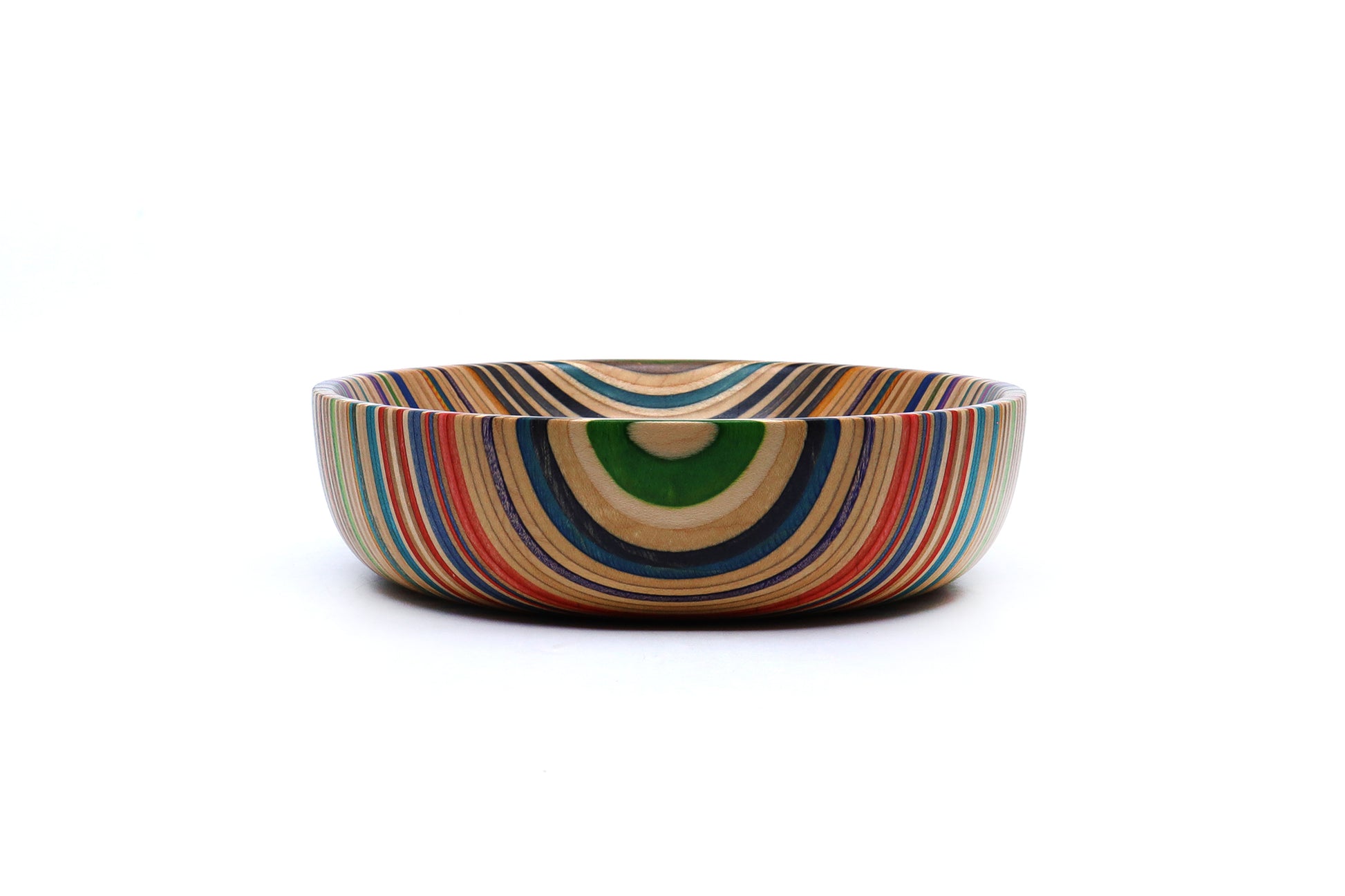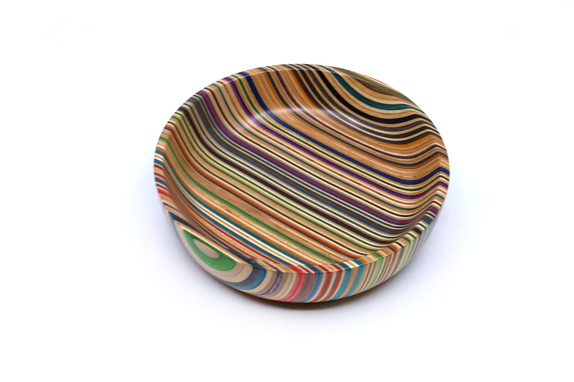 Our unique valet dishes are created from recycled skateboard noses and tails, laminated and expertly shaped on a lathe. These colorful, striking pieces can serve as decorative art or practical entryway bowls for keys and small items.