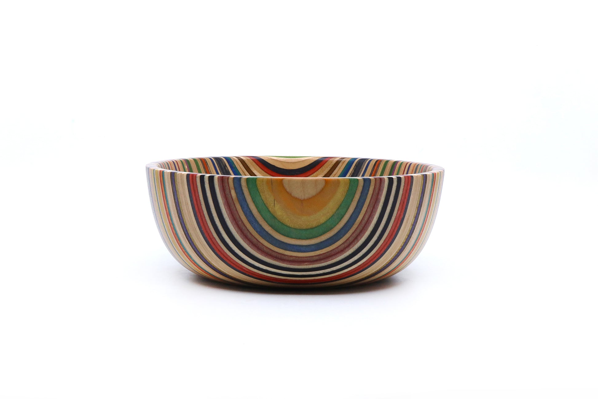 Our one-of-a-kind bowls are crafted from multiple repurposed skateboard noses and tails, carefully laminated and turned on a lathe to create vibrant, distinctive pieces that add a colorful and unique touch to your home decor!