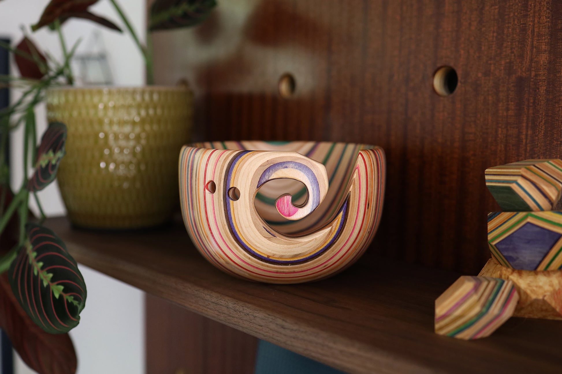 This bowl consists of multiple repurposed skateboard noses, laminated together and turned on the lathe.