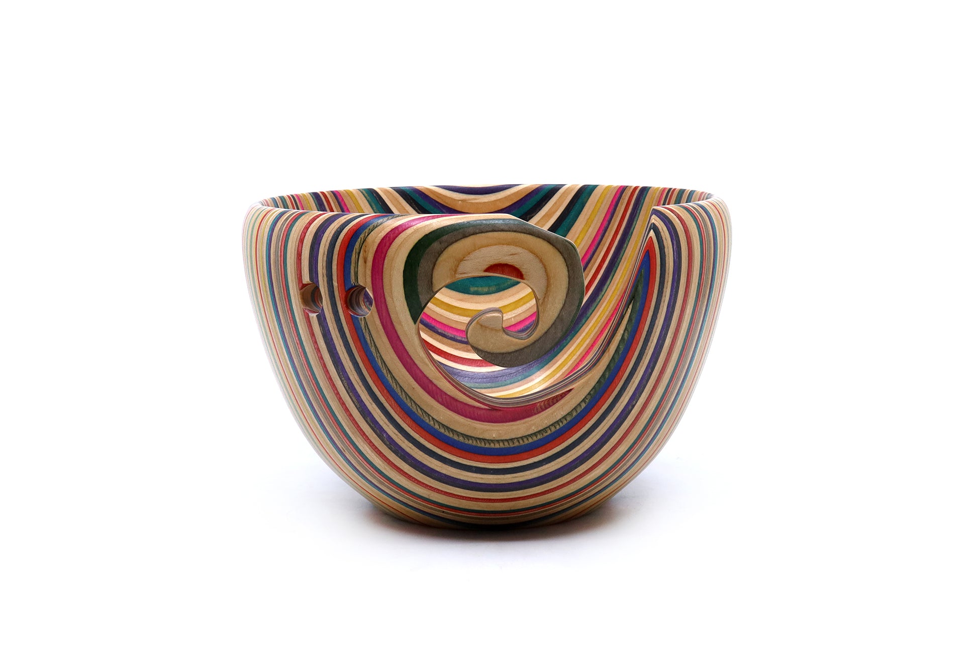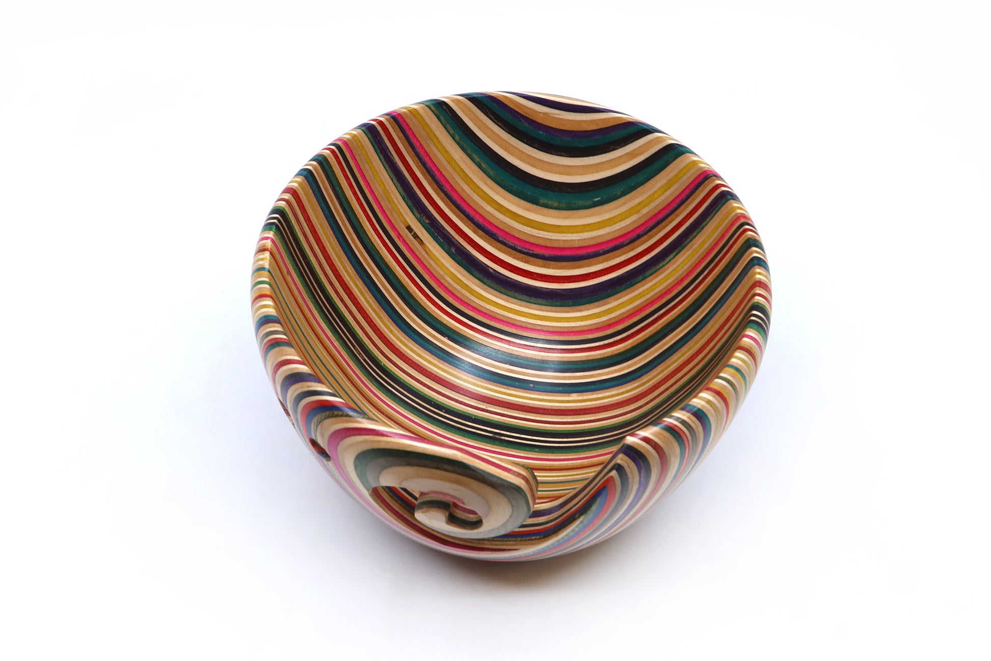 This bowl consists of multiple repurposed skateboard noses, laminated together and turned on the lathe.