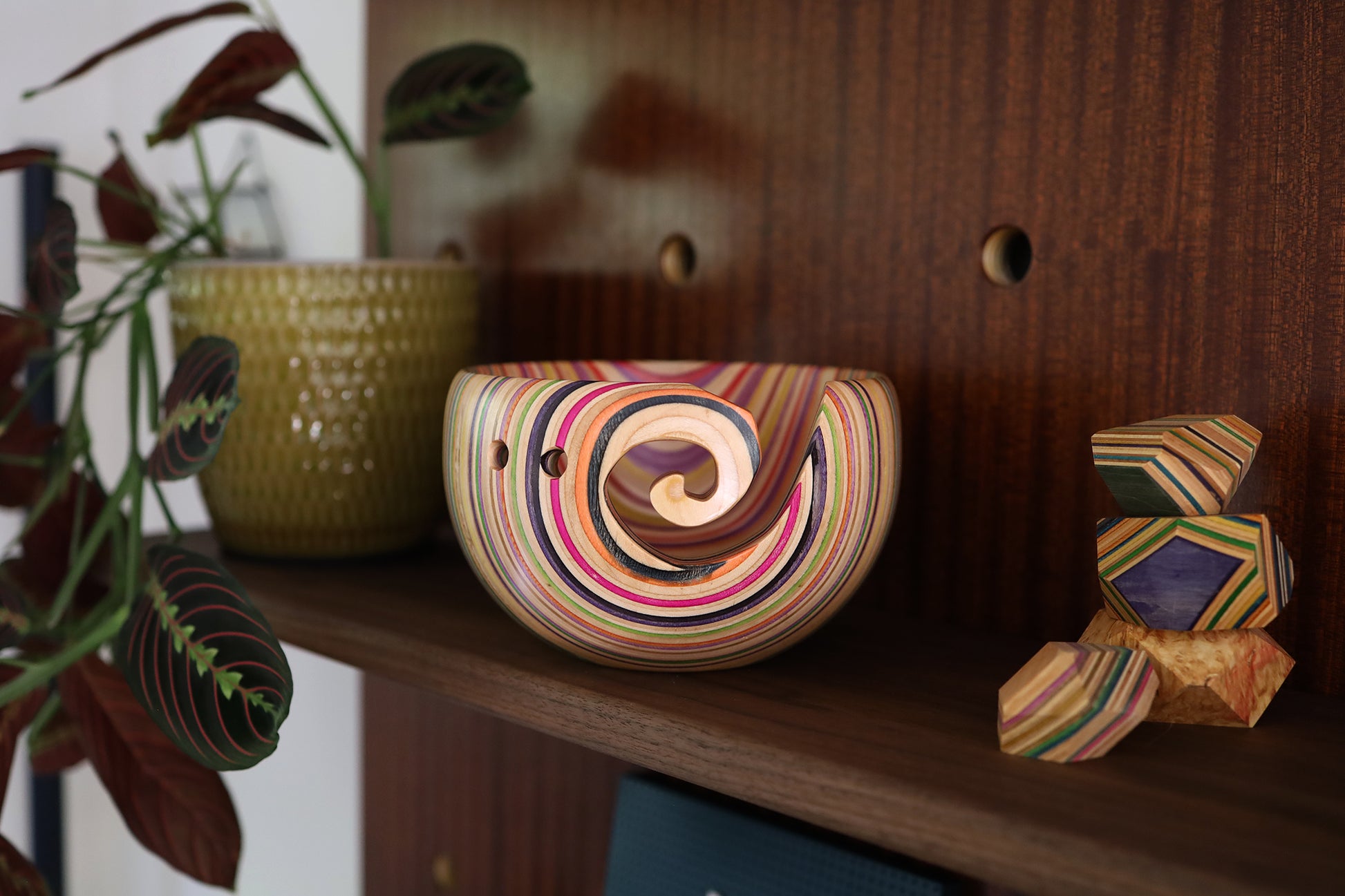 This bowl consists of multiple repurposed skateboard noses, laminated together and turned on the lathe.