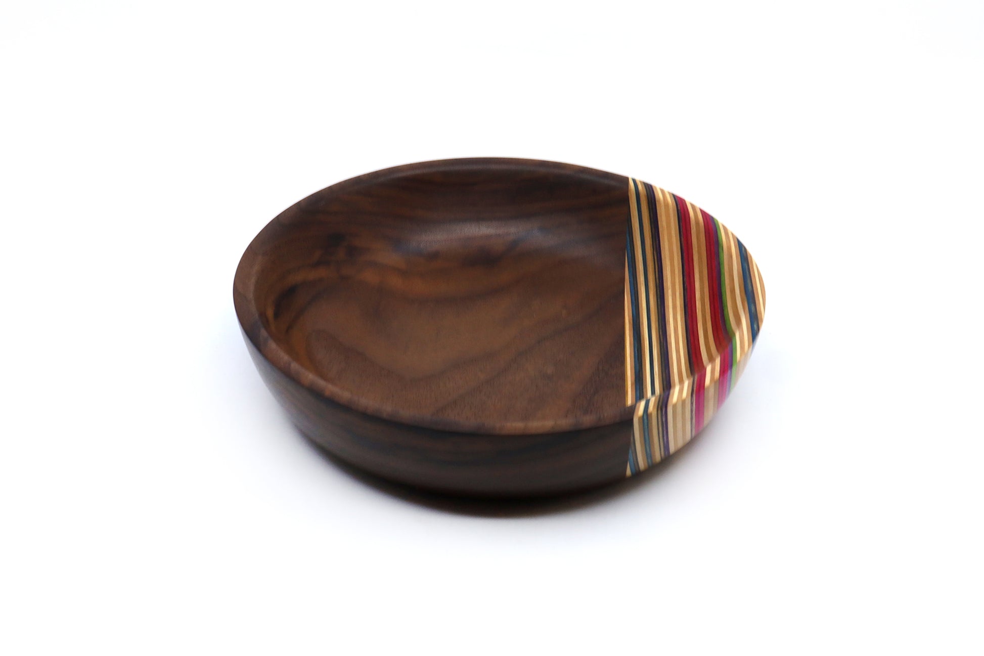 This valet dish would work great as a valet dish to hold your essentials or it will look stunning on its own! Made from repurposed skateboards and walnut off cuts from our furniture production.