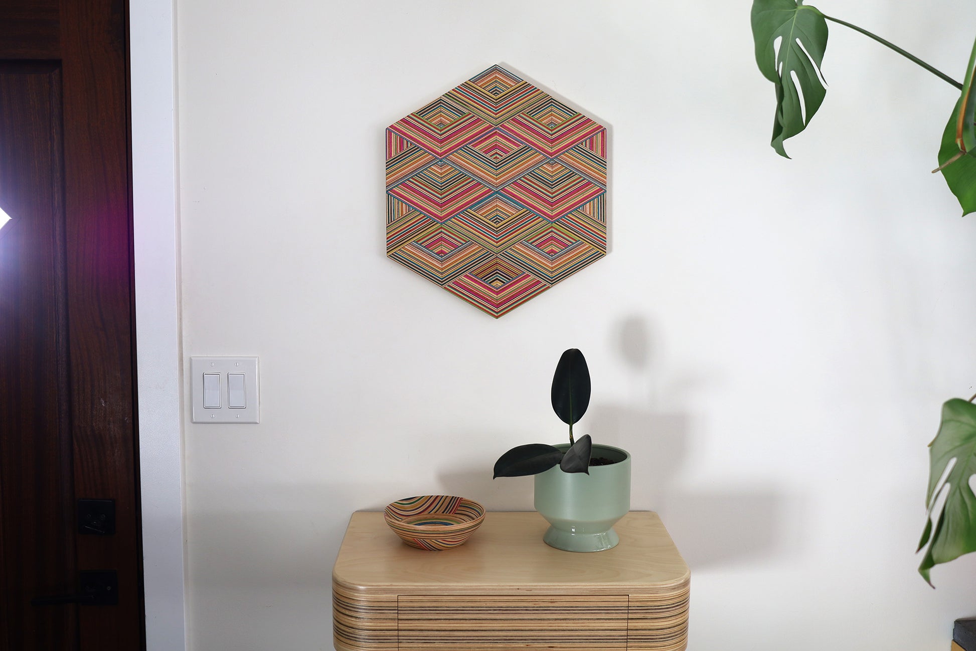 This geometric artwork is crafted from recycled skateboard and wenge blocks, creating an intriguing woven design. Each piece is entirely one-of-a-kind!