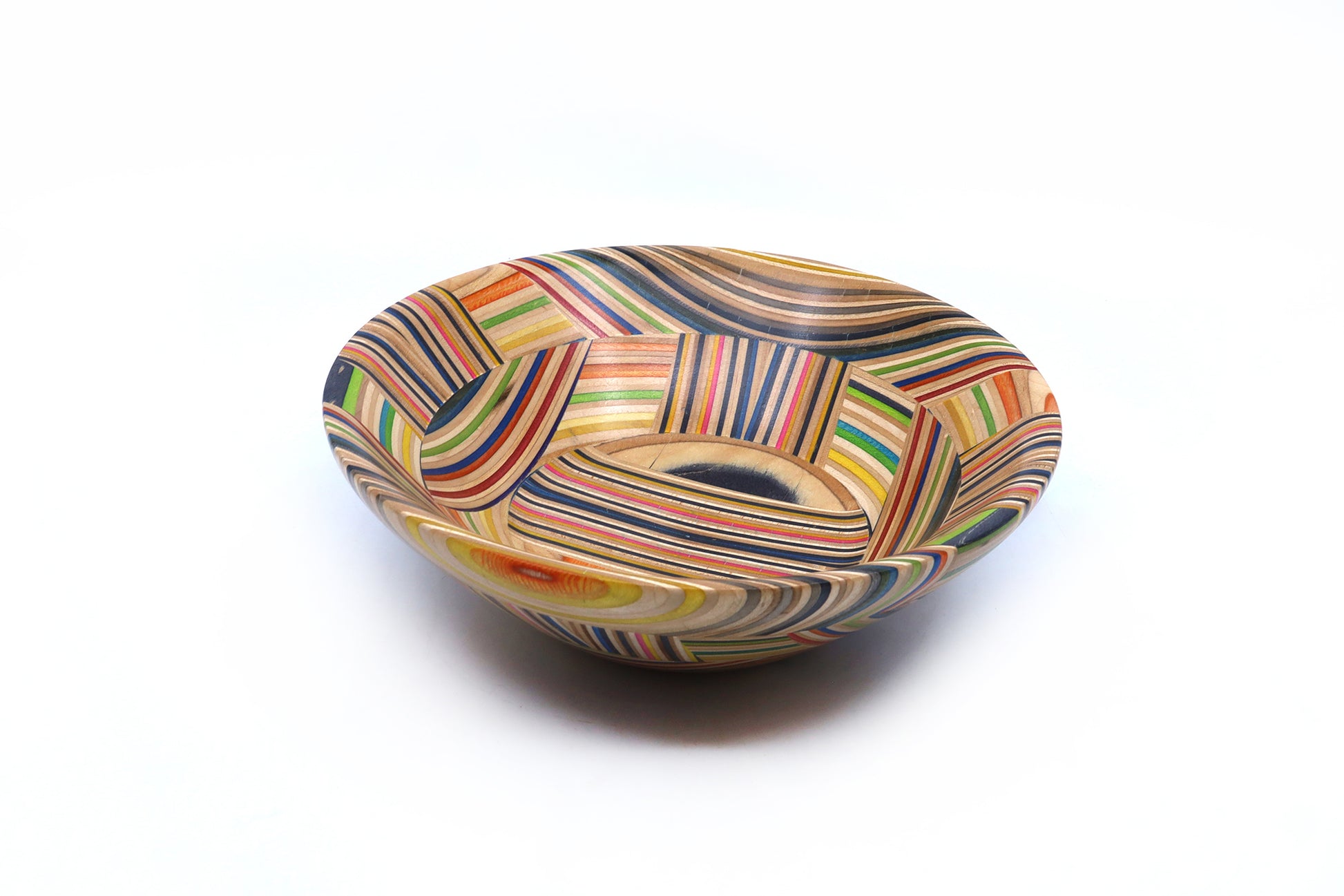 This skateboard bowl is the result of a new board lamination technique we have been experimenting with, in order to create a striking and unique design. This bowl is interesting from every angle and would make a neat centrepiece bowl for your table!