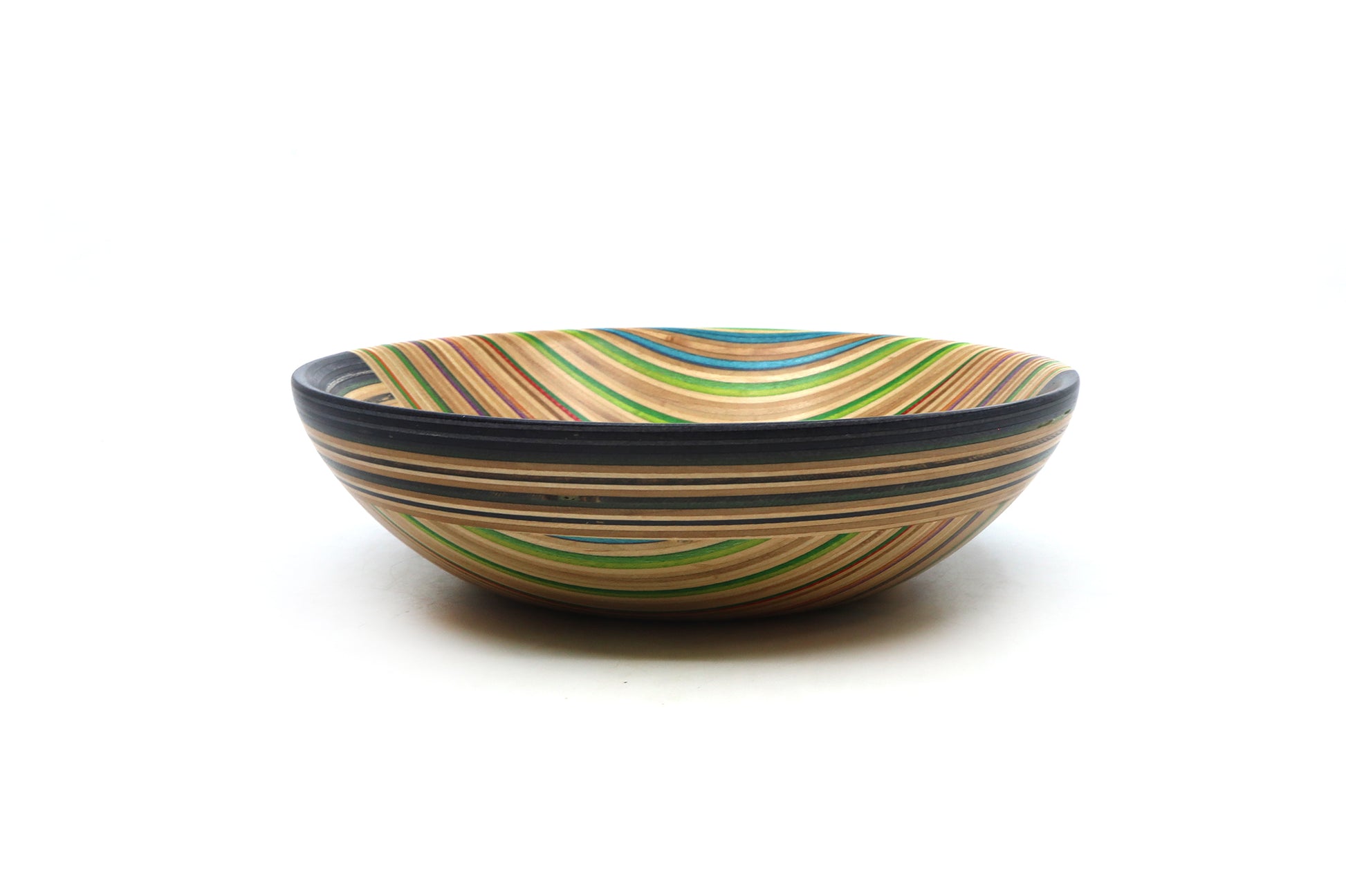 Our latest skateboard valet dishes showcase a new glue-up technique we've been experimenting with! Crafted from repurposed skateboard noses and tails, each piece is laminated and turned on the lathe to create something truly special. This layout style creates a colourful pattern that makes each dish visually captivating from every angle. Vibrant, uniquely versatile, and truly one of a kind!